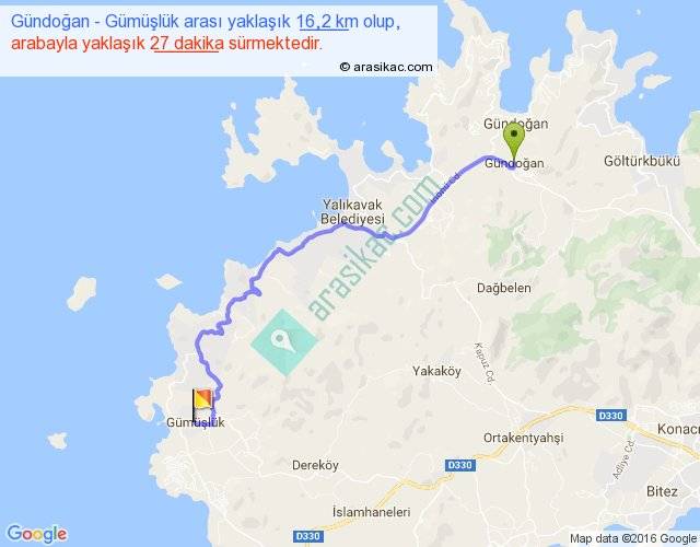 Gündoğan - Gümüşlük arası yaklaşık olarak 90 km/h ile yukarıda belirtilen sürede olup, iki yerin kuş uçuşu uzaklığı (mesafesi) 11'dir. Yolculuk otobüsle 35 dakika sürmektedir.