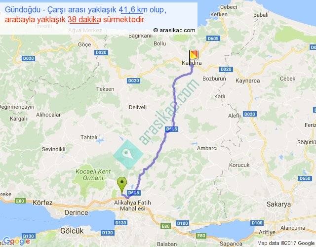 Gündoğdu - Çarşı arası yaklaşık olarak 90 km/h ile yukarıda belirtilen sürede olup, iki yerin kuş uçuşu uzaklığı (mesafesi) 34'dir. Yolculuk otobüsle 49 dakika sürmektedir.