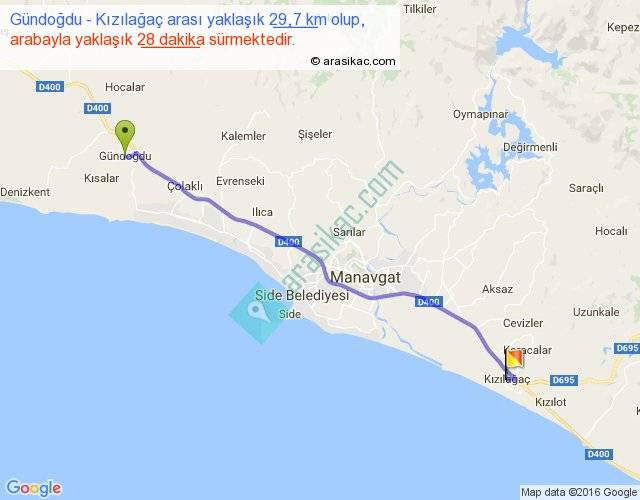 Gündoğdu - Kızılağaç arası yaklaşık olarak 90 km/h ile yukarıda belirtilen sürede olup, iki yerin kuş uçuşu uzaklığı (mesafesi) 27'dir. Yolculuk otobüsle 36 dakika sürmektedir.