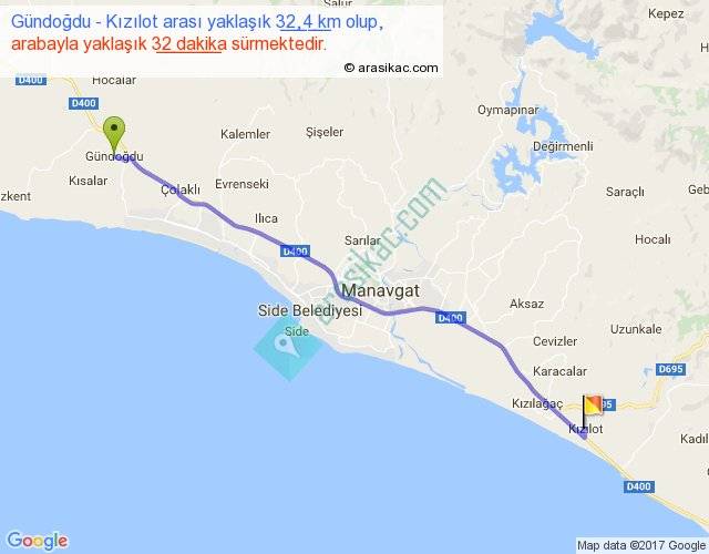 Gündoğdu - Kızılot arası yaklaşık olarak 90 km/h ile yukarıda belirtilen sürede olup, iki yerin kuş uçuşu uzaklığı (mesafesi) 30'dir. Yolculuk otobüsle 41 dakika sürmektedir.