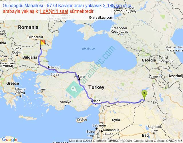 Gündoğdu Mahallesi - 9773 Karalar arası yaklaşık olarak 90 km/h ile yukarıda belirtilen sürede olup, iki yerin kuş uçuşu uzaklığı (mesafesi) 1496'dir. Eğer belirtilen yerler arasında uçak seferi var ise bu süre uçakla 2 saat 18 dakika'ya kadar düşebilir. Yolculuk otobüsle 1 gün 8 saat sürmektedir.