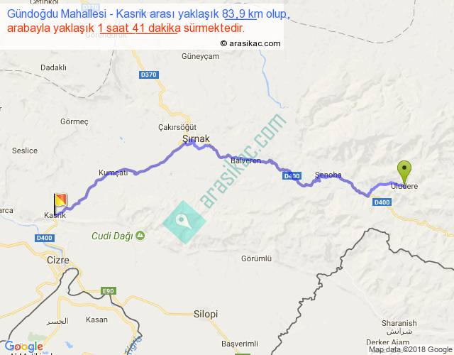 Gündoğdu Mahallesi - Kasrik arası yaklaşık olarak 90 km/h ile yukarıda belirtilen sürede olup, iki yerin kuş uçuşu uzaklığı (mesafesi) 60'dir. Yolculuk otobüsle 2 saat 11 dakika sürmektedir.