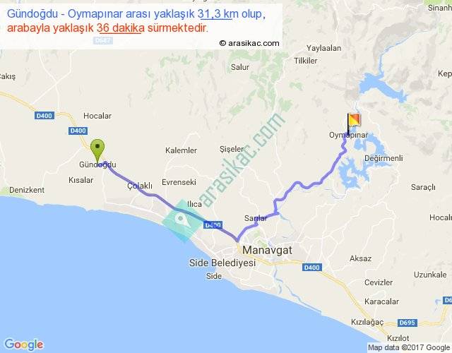Gündoğdu - Oymapınar arası yaklaşık olarak 90 km/h ile yukarıda belirtilen sürede olup, iki yerin kuş uçuşu uzaklığı (mesafesi) 22'dir. Yolculuk otobüsle 46 dakika sürmektedir.