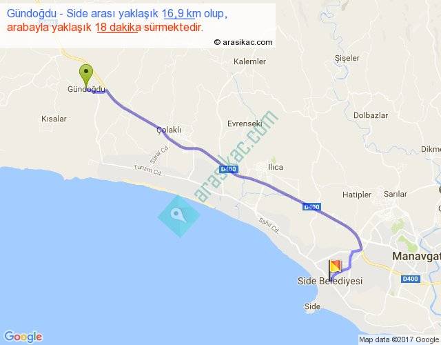 Gündoğdu - Side arası yaklaşık olarak 90 km/h ile yukarıda belirtilen sürede olup, iki yerin kuş uçuşu uzaklığı (mesafesi) 14'dir. Yolculuk otobüsle 23 dakika sürmektedir.