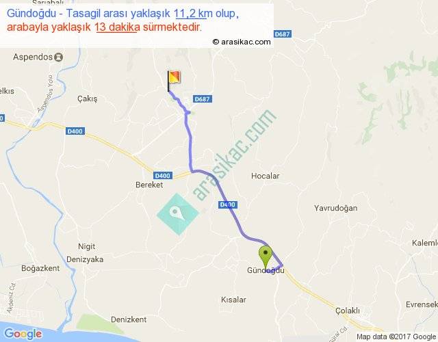 Gündoğdu - Tasagil arası yaklaşık olarak 90 km/h ile yukarıda belirtilen sürede olup, iki yerin kuş uçuşu uzaklığı (mesafesi) 9'dir. Yolculuk otobüsle 16 dakika sürmektedir.