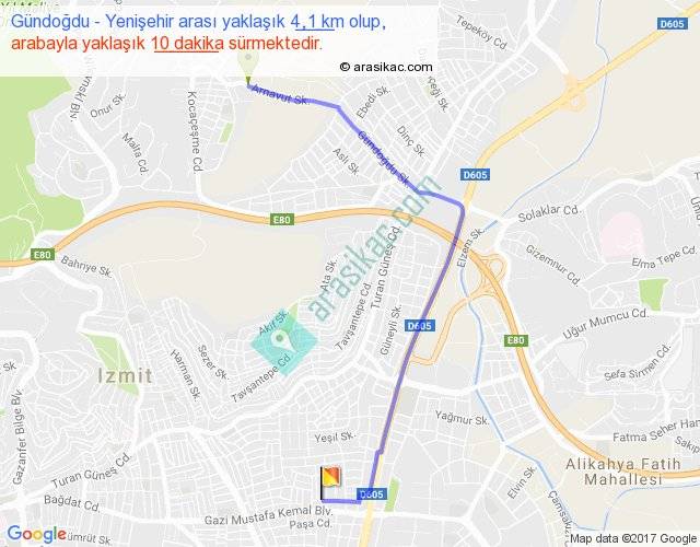 Gündoğdu - Yenişehir arası yaklaşık olarak 90 km/h ile yukarıda belirtilen sürede olup, iki yerin kuş uçuşu uzaklığı (mesafesi) 3'dir. Yolculuk otobüsle 13 dakika sürmektedir.