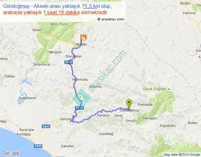 Gündoğmuş - Akseki arası yaklaşık olarak 90 km/h ile yukarıda belirtilen sürede olup, iki yerin kuş uçuşu uzaklığı (mesafesi) 31'dir. Yolculuk otobüsle 1 saat 38 dakika sürmektedir.
