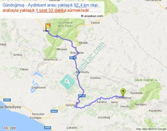 Gündoğmuş - Aydinkent arası yaklaşık olarak 90 km/h ile yukarıda belirtilen sürede olup, iki yerin kuş uçuşu uzaklığı (mesafesi) 47'dir. Yolculuk otobüsle 1 saat 59 dakika sürmektedir.