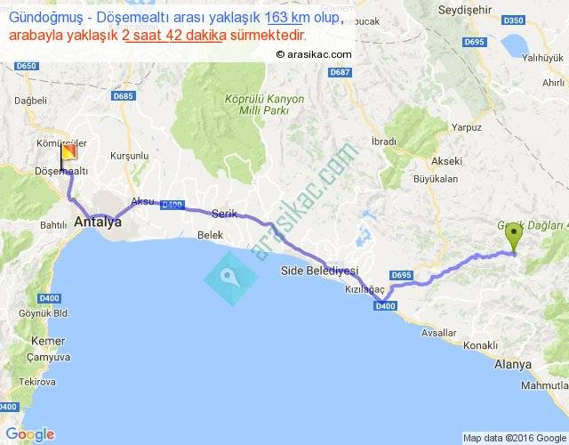 Gündoğmuş - Döşemealtı arası yaklaşık olarak 90 km/h ile yukarıda belirtilen sürede olup, iki yerin kuş uçuşu uzaklığı (mesafesi) 126'dir. Yolculuk otobüsle 3 saat 30 dakika sürmektedir.
