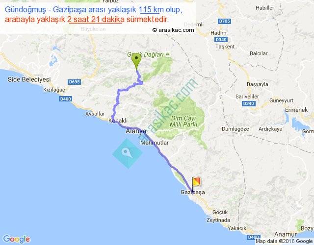 Gündoğmuş - Gazipaşa arası yaklaşık olarak 90 km/h ile yukarıda belirtilen sürede olup, iki yerin kuş uçuşu uzaklığı (mesafesi) 67'dir. Yolculuk otobüsle 3 saat 3 dakika sürmektedir.