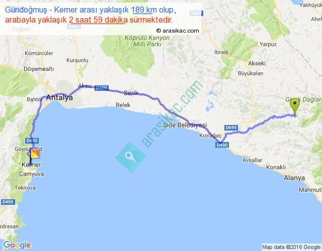 Gündoğmuş - Kemer arası yaklaşık olarak 90 km/h ile yukarıda belirtilen sürede olup, iki yerin kuş uçuşu uzaklığı (mesafesi) 130'dir. Yolculuk otobüsle 3 saat 52 dakika sürmektedir.