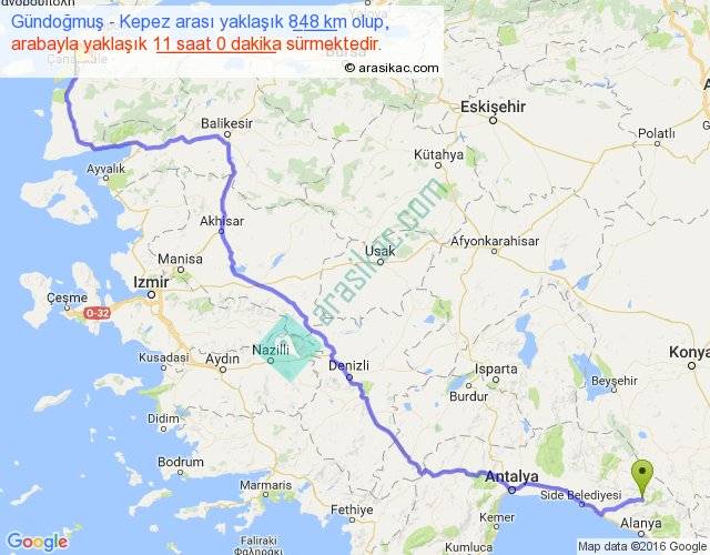 Gündoğmuş - Kepez arası yaklaşık olarak 90 km/h ile yukarıda belirtilen sürede olup, iki yerin kuş uçuşu uzaklığı (mesafesi) 606'dir. Eğer belirtilen yerler arasında uçak seferi var ise bu süre uçakla 55 dakika'ya kadar düşebilir. Yolculuk otobüsle 14 saat 18 dakika sürmektedir.