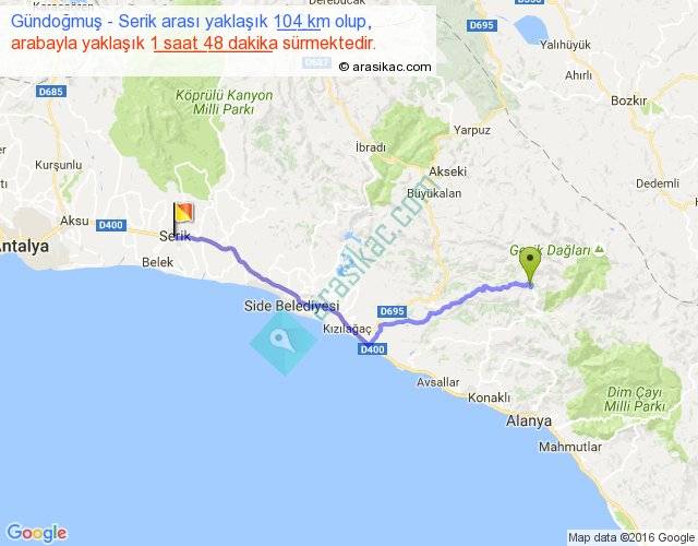 Gündoğmuş - Serik arası yaklaşık olarak 90 km/h ile yukarıda belirtilen sürede olup, iki yerin kuş uçuşu uzaklığı (mesafesi) 80'dir. Yolculuk otobüsle 2 saat 20 dakika sürmektedir.
