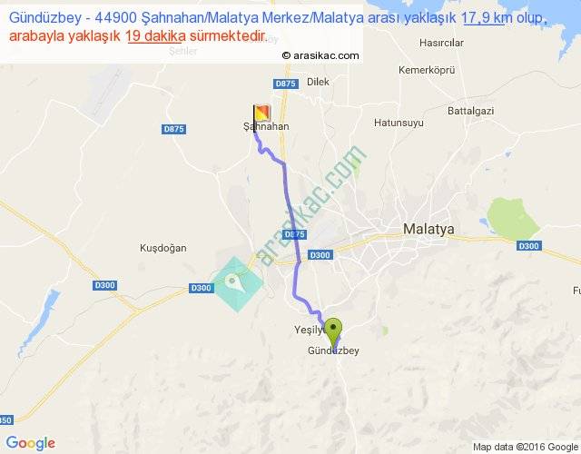 Gündüzbey - 44900 Şahnahan Malatya Merkez Malatya arası yaklaşık olarak 90 km/h ile yukarıda belirtilen sürede olup, iki yerin kuş uçuşu uzaklığı (mesafesi) 15'dir. Yolculuk otobüsle 24 dakika sürmektedir.