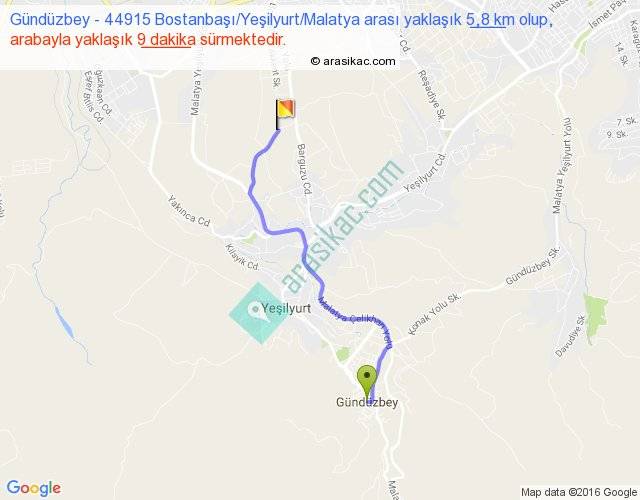 Gündüzbey - 44915 Bostanbaşı Yeşilyurt Malatya arası yaklaşık olarak 90 km/h ile yukarıda belirtilen sürede olup, iki yerin kuş uçuşu uzaklığı (mesafesi) 4'dir. Yolculuk otobüsle 11 dakika sürmektedir.