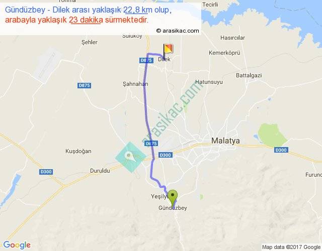 Gündüzbey - Dilek arası yaklaşık olarak 90 km/h ile yukarıda belirtilen sürede olup, iki yerin kuş uçuşu uzaklığı (mesafesi) 18'dir. Yolculuk otobüsle 29 dakika sürmektedir.