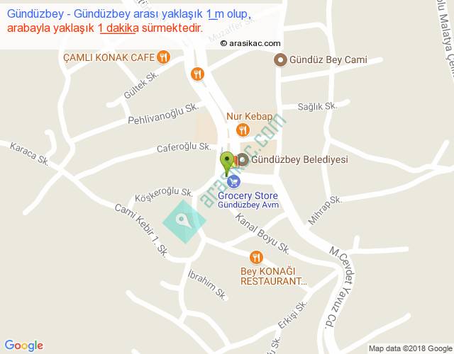 Gündüzbey - Gündüzbey arası yaklaşık olarak 90 km/h ile yukarıda belirtilen sürede olup, iki yerin kuş uçuşu uzaklığı (mesafesi) 0'dir. Yolculuk otobüsle 1 dakika sürmektedir.