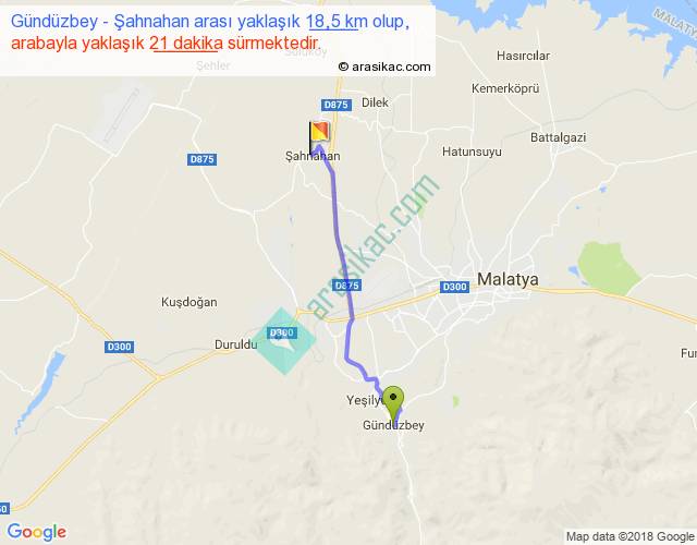 Gündüzbey - Şahnahan arası yaklaşık olarak 90 km/h ile yukarıda belirtilen sürede olup, iki yerin kuş uçuşu uzaklığı (mesafesi) 15'dir. Yolculuk otobüsle 27 dakika sürmektedir.