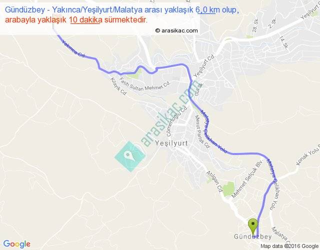 Gündüzbey - Yakınca Yeşilyurt Malatya arası yaklaşık olarak 90 km/h ile yukarıda belirtilen sürede olup, iki yerin kuş uçuşu uzaklığı (mesafesi) 4'dir. Yolculuk otobüsle 13 dakika sürmektedir.