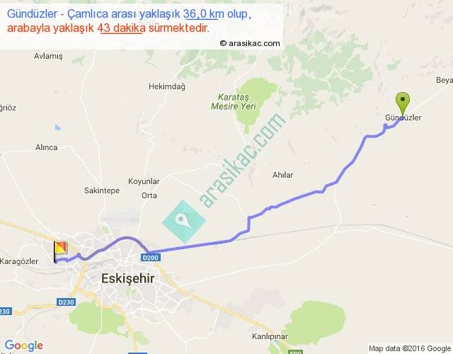 Gündüzler - Çamlıca arası yaklaşık olarak 90 km/h ile yukarıda belirtilen sürede olup, iki yerin kuş uçuşu uzaklığı (mesafesi) 31'dir. Yolculuk otobüsle 55 dakika sürmektedir.