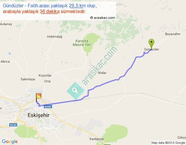 Gündüzler - Fatih arası yaklaşık olarak 90 km/h ile yukarıda belirtilen sürede olup, iki yerin kuş uçuşu uzaklığı (mesafesi) 25'dir. Yolculuk otobüsle 46 dakika sürmektedir.