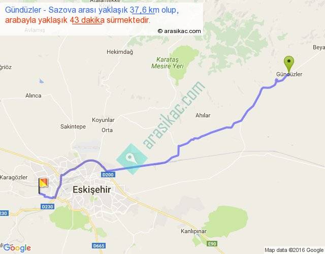 Gündüzler - Sazova arası yaklaşık olarak 90 km/h ile yukarıda belirtilen sürede olup, iki yerin kuş uçuşu uzaklığı (mesafesi) 32'dir. Yolculuk otobüsle 55 dakika sürmektedir.
