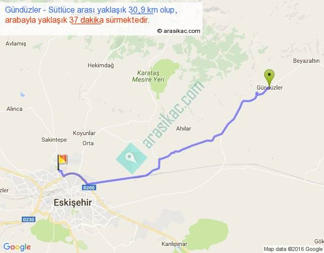 Gündüzler - Sütlüce arası yaklaşık olarak 90 km/h ile yukarıda belirtilen sürede olup, iki yerin kuş uçuşu uzaklığı (mesafesi) 26'dir. Yolculuk otobüsle 48 dakika sürmektedir.
