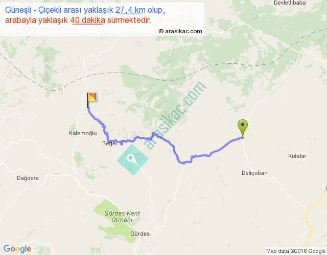 Güneşli - Çiçekli arası yaklaşık olarak 90 km/h ile yukarıda belirtilen sürede olup, iki yerin kuş uçuşu uzaklığı (mesafesi) 18'dir. Yolculuk otobüsle 52 dakika sürmektedir.
