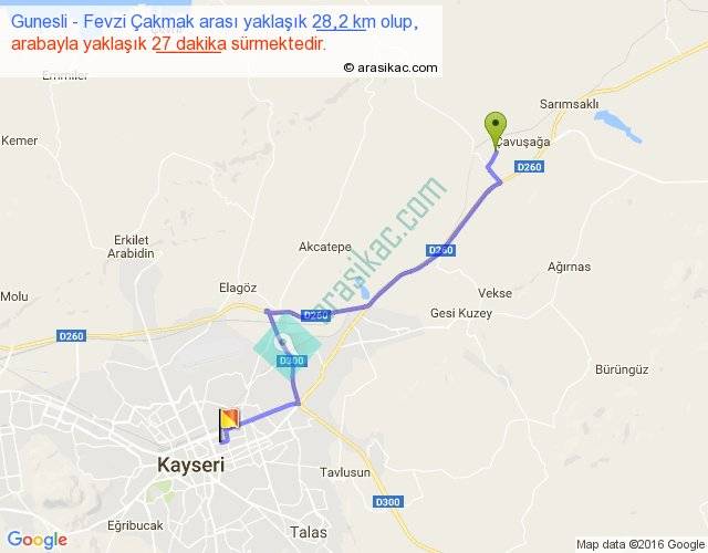 Gunesli - Fevzi Çakmak arası yaklaşık olarak 90 km/h ile yukarıda belirtilen sürede olup, iki yerin kuş uçuşu uzaklığı (mesafesi) 21'dir. Yolculuk otobüsle 35 dakika sürmektedir.
