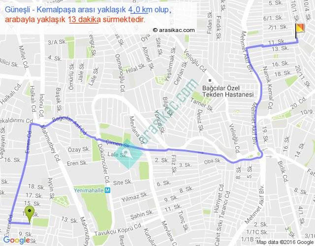 Güneşli - Kemalpaşa arası yaklaşık olarak 90 km/h ile yukarıda belirtilen sürede olup, iki yerin kuş uçuşu uzaklığı (mesafesi) 2'dir. Yolculuk otobüsle 16 dakika sürmektedir.