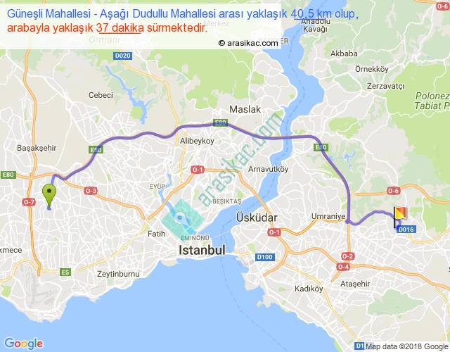 Güneşli Mahallesi - Aşağı Dudullu Mahallesi arası yaklaşık olarak 90 km/h ile yukarıda belirtilen sürede olup, iki yerin kuş uçuşu uzaklığı (mesafesi) 28'dir. Yolculuk otobüsle 48 dakika sürmektedir.