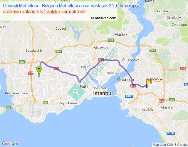 Güneşli Mahallesi - Bulgurlu Mahallesi arası yaklaşık olarak 90 km/h ile yukarıda belirtilen sürede olup, iki yerin kuş uçuşu uzaklığı (mesafesi) 21'dir. Yolculuk otobüsle 48 dakika sürmektedir.