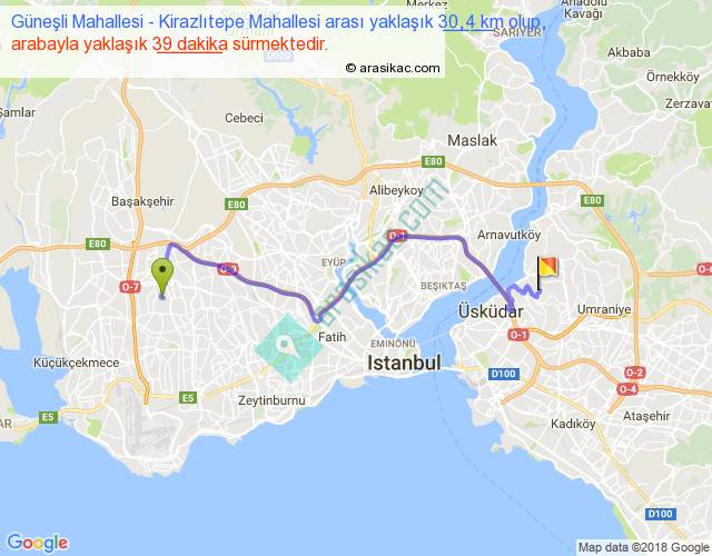 Güneşli Mahallesi - Kirazlıtepe Mahallesi arası yaklaşık olarak 90 km/h ile yukarıda belirtilen sürede olup, iki yerin kuş uçuşu uzaklığı (mesafesi) 19'dir. Yolculuk otobüsle 50 dakika sürmektedir.