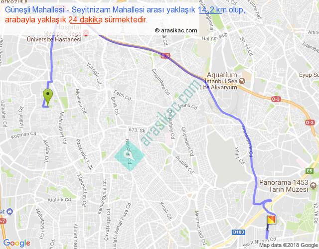 Güneşli Mahallesi - Seyitnizam Mahallesi arası yaklaşık olarak 90 km/h ile yukarıda belirtilen sürede olup, iki yerin kuş uçuşu uzaklığı (mesafesi) 7'dir. Yolculuk otobüsle 31 dakika sürmektedir.