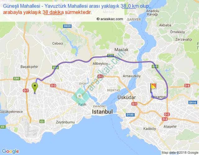 Güneşli Mahallesi - Yavuztürk Mahallesi arası yaklaşık olarak 90 km/h ile yukarıda belirtilen sürede olup, iki yerin kuş uçuşu uzaklığı (mesafesi) 21'dir. Yolculuk otobüsle 49 dakika sürmektedir.