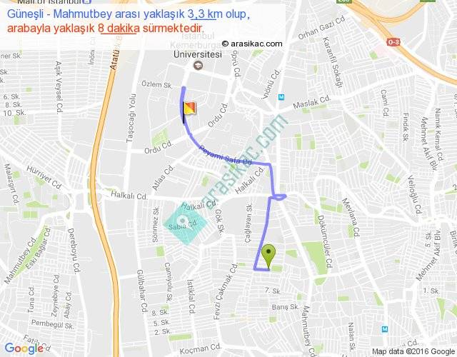 Güneşli - Mahmutbey arası yaklaşık olarak 90 km/h ile yukarıda belirtilen sürede olup, iki yerin kuş uçuşu uzaklığı (mesafesi) 2'dir. Yolculuk otobüsle 10 dakika sürmektedir.