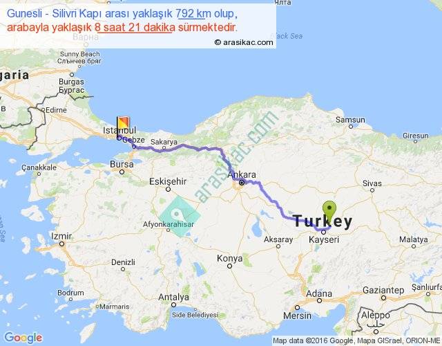 Gunesli - Silivri Kapı arası yaklaşık olarak 90 km/h ile yukarıda belirtilen sürede olup, iki yerin kuş uçuşu uzaklığı (mesafesi) 618'dir. Eğer belirtilen yerler arasında uçak seferi var ise bu süre uçakla 57 dakika'ya kadar düşebilir. Yolculuk otobüsle 10 saat 51 dakika sürmektedir.