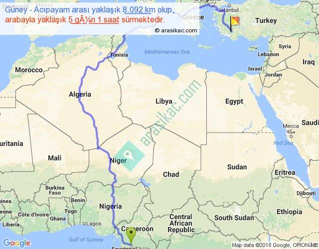 Güney - Acıpayam arası yaklaşık olarak 90 km/h ile yukarıda belirtilen sürede olup, iki yerin kuş uçuşu uzaklığı (mesafesi) 4231'dir. Eğer belirtilen yerler arasında uçak seferi var ise bu süre uçakla 6 saat 30 dakika'ya kadar düşebilir. Yolculuk otobüsle 6 gün 13 saat sürmektedir.
