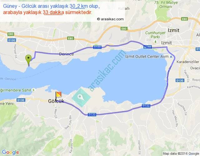 Güney - Gölcük arası yaklaşık olarak 90 km/h ile yukarıda belirtilen sürede olup, iki yerin kuş uçuşu uzaklığı (mesafesi) 4'dir. Yolculuk otobüsle 42 dakika sürmektedir.