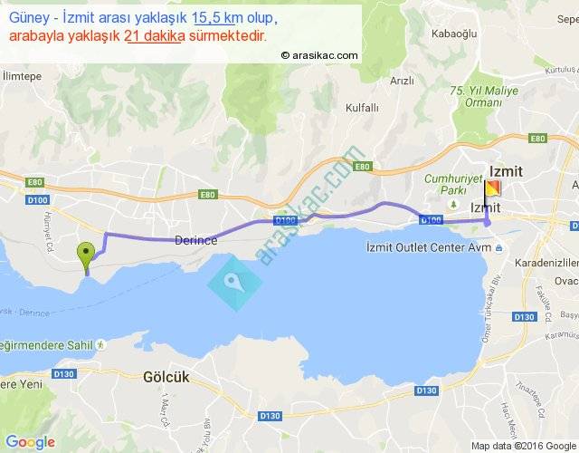 Güney - İzmit arası yaklaşık olarak 90 km/h ile yukarıda belirtilen sürede olup, iki yerin kuş uçuşu uzaklığı (mesafesi) 13'dir. Yolculuk otobüsle 27 dakika sürmektedir.