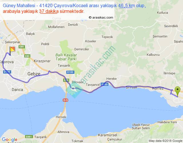 Güney Mahallesi - 41420 Çayırova Kocaeli arası yaklaşık olarak 90 km/h ile yukarıda belirtilen sürede olup, iki yerin kuş uçuşu uzaklığı (mesafesi) 35'dir. Yolculuk otobüsle 48 dakika sürmektedir.