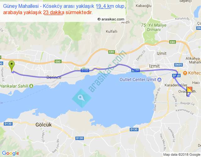 Güney Mahallesi - Köseköy arası yaklaşık olarak 90 km/h ile yukarıda belirtilen sürede olup, iki yerin kuş uçuşu uzaklığı (mesafesi) 16'dir. Yolculuk otobüsle 29 dakika sürmektedir.