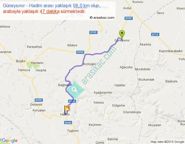 Güneysınır - Hadim arası yaklaşık olarak 90 km/h ile yukarıda belirtilen sürede olup, iki yerin kuş uçuşu uzaklığı (mesafesi) 39'dir. Yolculuk otobüsle 1 saat 1 dakika sürmektedir.