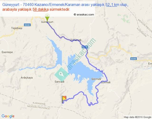 Güneyyurt - 70460 Kazancı Ermenek Karaman arası yaklaşık olarak 90 km/h ile yukarıda belirtilen sürede olup, iki yerin kuş uçuşu uzaklığı (mesafesi) 21'dir. Yolculuk otobüsle 1 saat 15 dakika sürmektedir.
