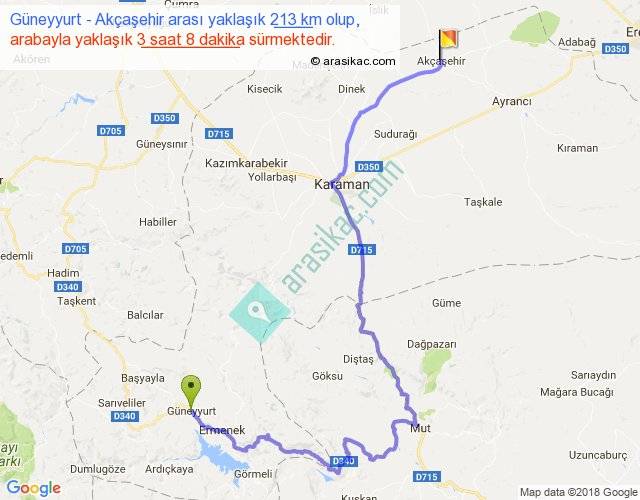 Güneyyurt - Akçaşehir arası yaklaşık olarak 90 km/h ile yukarıda belirtilen sürede olup, iki yerin kuş uçuşu uzaklığı (mesafesi) 104'dir. Yolculuk otobüsle 4 saat 4 dakika sürmektedir.