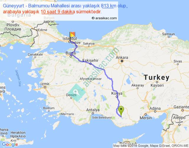 Güneyyurt - Balmumcu Mahallesi arası yaklaşık olarak 90 km/h ile yukarıda belirtilen sürede olup, iki yerin kuş uçuşu uzaklığı (mesafesi) 583'dir. Eğer belirtilen yerler arasında uçak seferi var ise bu süre uçakla 53 dakika'ya kadar düşebilir. Yolculuk otobüsle 13 saat 11 dakika sürmektedir.
