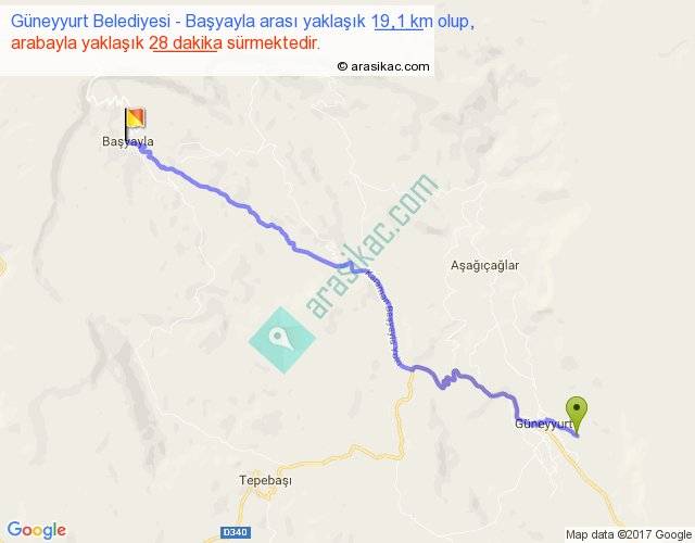Güneyyurt Belediyesi - Başyayla arası yaklaşık olarak 90 km/h ile yukarıda belirtilen sürede olup, iki yerin kuş uçuşu uzaklığı (mesafesi) 15'dir. Yolculuk otobüsle 36 dakika sürmektedir.