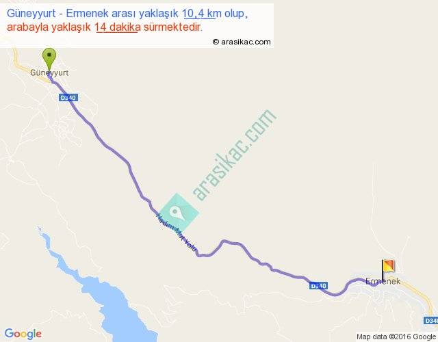 Güneyyurt - Ermenek arası yaklaşık olarak 90 km/h ile yukarıda belirtilen sürede olup, iki yerin kuş uçuşu uzaklığı (mesafesi) 9'dir. Yolculuk otobüsle 18 dakika sürmektedir.