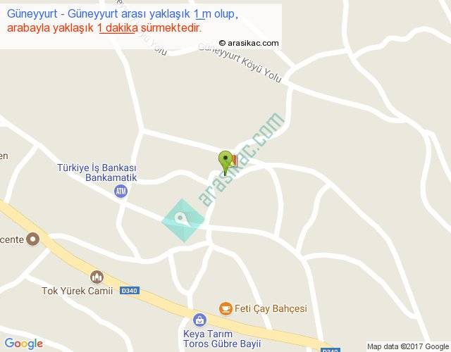 Güneyyurt - Güneyyurt arası yaklaşık olarak 90 km/h ile yukarıda belirtilen sürede olup, iki yerin kuş uçuşu uzaklığı (mesafesi) 0'dir. Yolculuk otobüsle 1 dakika sürmektedir.