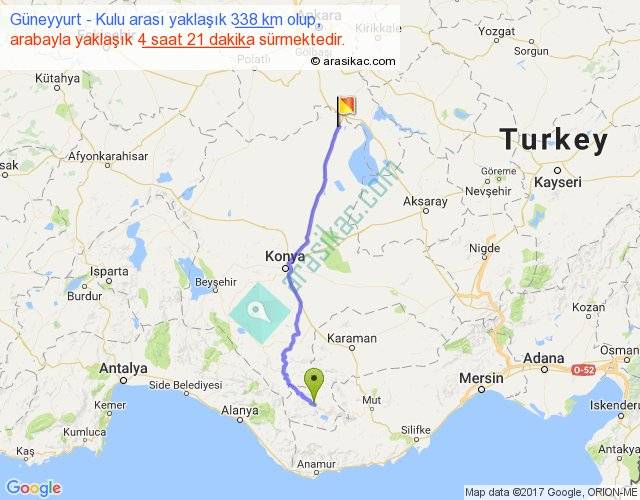 Güneyyurt - Kulu arası yaklaşık olarak 90 km/h ile yukarıda belirtilen sürede olup, iki yerin kuş uçuşu uzaklığı (mesafesi) 267'dir. Eğer belirtilen yerler arasında uçak seferi var ise bu süre uçakla 24 dakika'ya kadar düşebilir. Yolculuk otobüsle 5 saat 39 dakika sürmektedir.